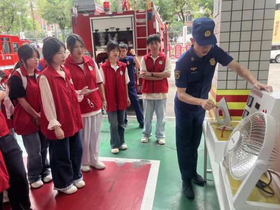 在消防站科普区的火灾模拟系统前,宣讲员通过电气短路、油锅起火等实验,揭示隐患成灾原理。最具挑战性的是“居民楼火灾疏散演练”,志愿者们分组扮演“报警人”“引导员”“搜救员”,从发现火情、规范拨打119报警,到用湿毛巾捂鼻组织人员疏散、标记安全区域等待救援,全流程还原应急处置场景。演练中,队员们严格遵循“弯腰低姿”“沿墙行进”等规范,在浓烟模拟环境中展现出良好的协作能力,圆满完成被困人员“搜救转移”任务。
