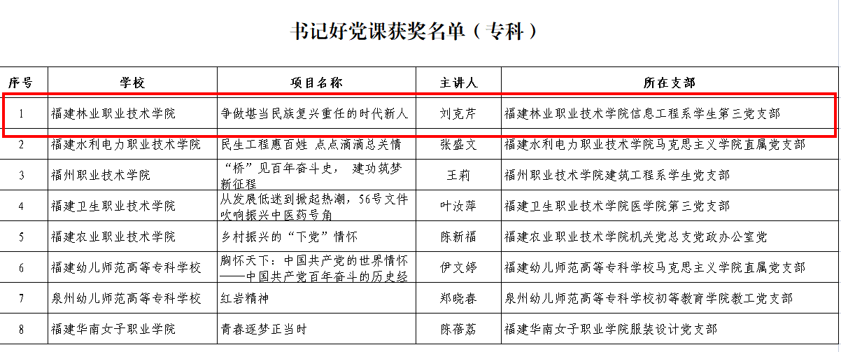 近日,中共福建省委教育工作委员会公示了“书记好党课、支部好案例”评选结果,其中高职高专院校“书记好党课”“支部好案例”各8项,我系学生第三党支部书记刘克芹老师党课《争做堪当民族复兴重任的时代新人》、学生第一党支部好案例《党建进宿舍,一灯燃百炬》分别获奖。这是继我系2020年教工支部申报的支部立项获得福建省高职高专院校党支部工作“立项活动”优秀成果一等奖、2021年系党总支被授予“福建省高校先进基层党组织”荣誉称号、2022年系党建工作品牌项目“多措并举推进党建工作提质增效”入选福建省新时代党建优秀案例、2022年系党总支正式成为“第二批全国党建工作标杆院系”后,我系在创先争优工作中取得的又一成果。