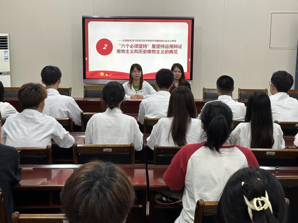 学生第一党支部书记郑燕丽老师详细讲解了“六个必须坚持”的内涵。即必须坚持人民至上,坚持和发展马克思主义唯物史观的基本观点,体现人民历史主体性与价值主体性的辩证统一。必须坚持自信自立,坚持和发展马克思主义实践观和认识论,体现客观规律性与主观能动性的辩证统一。必须坚持守正创新,坚持和发展马克思主义的发展观,体现继承性与创新性的辩证统一。必须坚持问题导向,坚持和发展马克思主义的矛盾论,体现矛盾普遍性与特殊性的辩证统一。必须坚持系统观念,坚持和发展马克思主义普遍联系的观点,体现整体与部分的辩证统一。必须坚持胸怀天下,坚持和发展马克思主义为人类求解放的世界历史观,体现世界性与民族性的辩证统一。