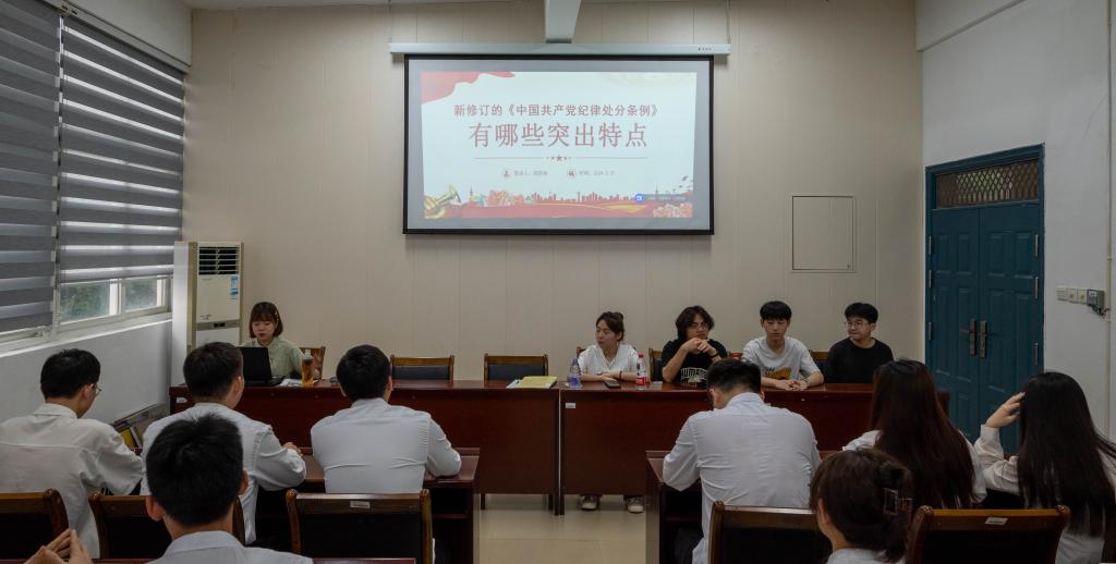 为确保深入学习,信息工程系学生第一党支部全体党员集中学习《中国共产党纪律处分条例》,并要求在学习的过程中,做到逐字逐句学、原原本本学。同时,支部书记郑燕丽对《新修订的<中国共产党纪律处分条例>有哪些突出特点》进行深入解析。