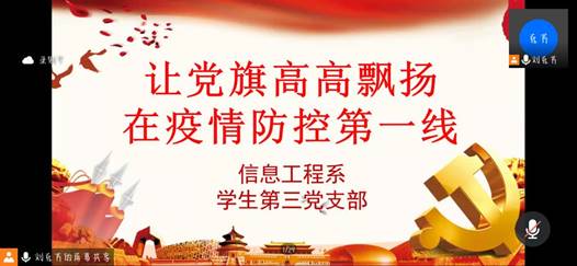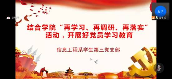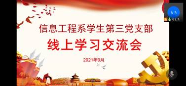 在疫情防控特殊时期,为扎实开展党员学习教育,9月26日晚信息工程系学生第三党支部在腾讯会议平台举行本月支部线上学习交流会议,会议由党支部书记刘克芹老师主持,支部全体师生党员、入党积极分子参会。