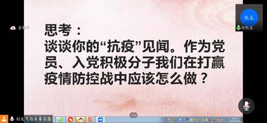 随后,针对现阶段疫情防控的特殊形势和党员先锋模范作用的发挥,支部师生结合近期的一些“抗疫”见闻,开展“让党旗高高飘扬在疫情防控第一线””的话题讨论,就党员、入党积极分子在防疫过程中应该如何行动发表自己的观点。刘克芹老师带领大家一同学习了《致全院各基层党组织、全体共产党员的倡议书》,鼓励学生党员、入党积极分子从自己做起、从身边小事做起,遵守疫情防控规定,积极配合工作,尽自己所能筑牢疫情防控安全屏障,共同打赢疫情防控战。