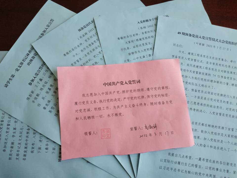 2022年3月17日下午16时,建筑工程系党总支在实训一5楼党员活动室举行第49期中共预备党员入党宣誓仪式,对预备党员进行一次庄严而生动的党性教育。建筑工程系党总支专职组织员叶新颖、学生第一党支部书记林燕琼、学生第二党支部书记吴文杰、学生第三党支部书记温全军及74名中共预备党员和10名入党积极分子代表出席仪式,入党仪式由学生第三党支部书记温全军老师主持。