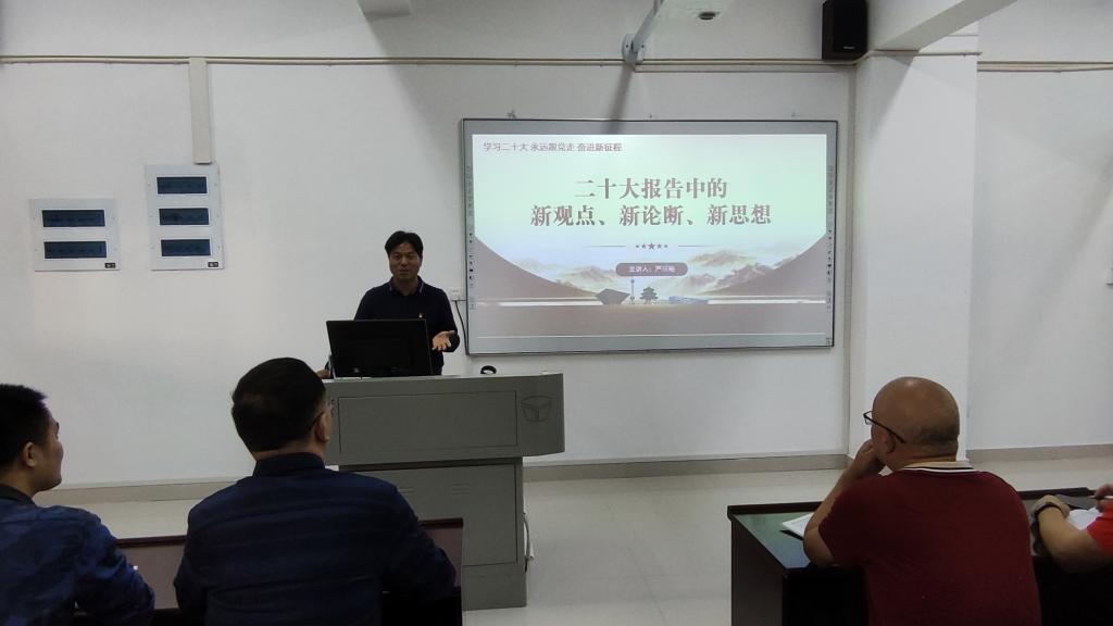 党课上,严副书记主要围绕“大会主题”“三个务必”“十年来三件大事”“党的中心任务”“中国式现代化”“五个必由之路”等具体内容展开论述,简要梳理了二十大报告中的新观点、新论断、新思想。他表示,党的二十大是在全党全国各族人民迈上全面建设社会主义现代化国家新征程、向第二个百年奋斗目标进军关键时刻召开的一次十分重要的大会。他指出,党的二十大全面总结了过去5年工作和新时代10年的伟大变革,系统阐述了新时代坚持和发展中国特色社会主义的重大理论和实践问题,科学谋划了未来一个时期党和国家事业发展的目标任务和大政方针,是团结动员全党全国各族人民全面建设社会主义现代化国家、全面推进中华民族伟大复兴的政治宣言和行动纲领。他强调,我们应该积极响应党的号召,高举中国特色社会主义伟大旗帜,全面贯彻新时代中国特色社会主义思想,弘扬伟大建党精神,自信自强、守正创新,踔厉奋发、勇毅前行,为全面建设社会主义现代化国家、全面推进中华民族伟大复兴而团结奋斗。