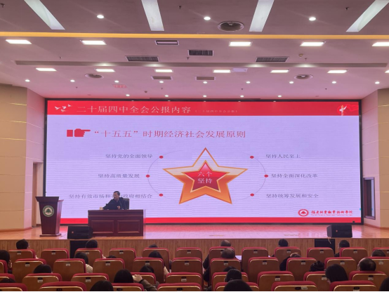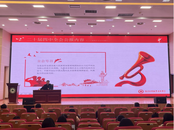 更新时间:2025/11/28 15:27本网讯 为深入学习党的二十届四中全会精神,引导广大教职工切实把思想和行动统一到党中央的决策部署上来,深刻把握其在党和国家事业发展进程中的里程碑意义,2025年11月27日下午,学院副院长黄晖在江南校区图书馆报告厅上《党的二十届四中全会公报》专题党课。经济管理系、继续教育学院、招生就业处、现代教育技术中心及教务处全体教职工党员参加学习。本场宣讲由经济管理系副书记张翼翔主持。