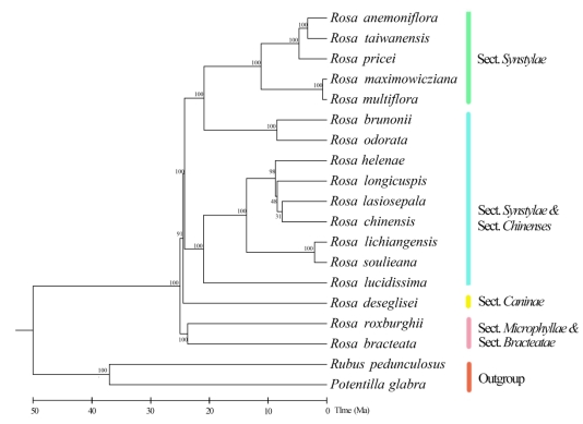 由于银粉蔷薇缺乏相关的分子生物学和遗传研究,这种濒危植物尚未得到有效保护。为了给其保护提供更科学的依据,利用下一代高通量测序技术获得了高质量的银粉蔷薇叶绿体基因组序列。随后,通过比较基因组分析,揭示了银粉蔷薇与近缘非濒危植物叶绿体基因组的差异,以推测其濒危风险是否由叶绿体基因组的变异引起。此外,系统发育分析阐明了银粉蔷薇的进化历史,而生物地理分析则明确了其祖先的分布区域。研究结果表明,银粉蔷薇与其近缘植物的叶绿体基因组差异较小,表明其濒危风险不是由叶绿体基因组变异引起的。然而,高度多态性的atpH-atpI区可作为区分银粉蔷薇与其近缘植物的DNA条形码。最后,结果证实银粉蔷薇属于蔷薇科蔷薇属合柱组,银粉蔷薇及其近缘植物可能起源于中国福建和台湾地区,并在大约271700年前开始分化。研究结果为未来的生物多样性保护和遗传资源管理提供了重要的参考。