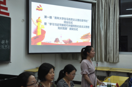 在第一期“青年大学生马克思主义理论读书社”结业仪式上,指导教师廖丹滟作了总结发言;“青马社”社长陈添煜同学作了学习感言,他谈到:在这一年的社团活动中,收获斐然,期盼可以继续参加第二期“青马社”的学习活动;仪式上表彰了“优秀学员”。