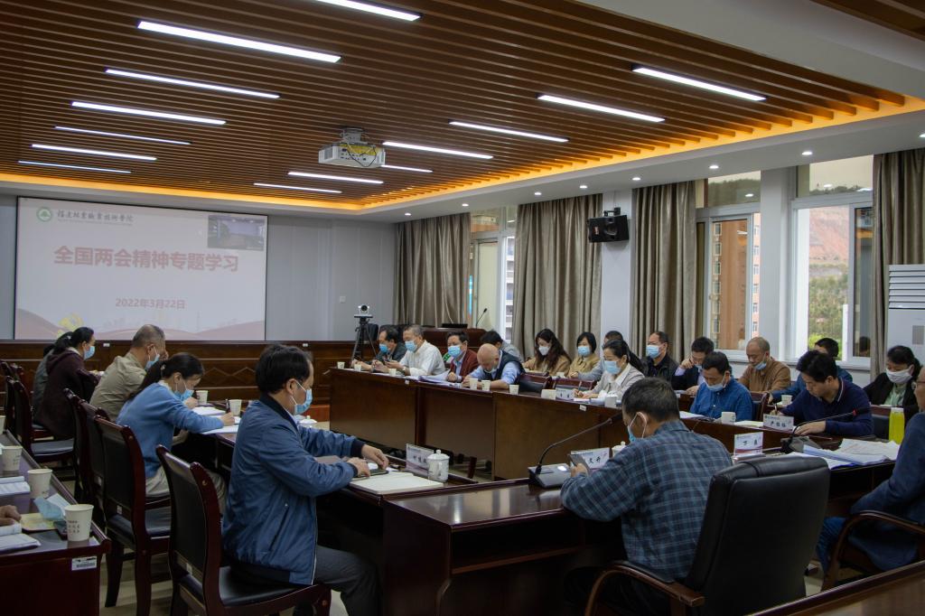 万泉书记传达学习贯彻习近平总书记出席全国两会有关会议时的重要讲话精神和全国两会精神,领学了习近平总书记在参加内蒙古代表团审议时的重要讲话精神、习近平看望参加政协会议的农业界社会福利和社会保障界委员时的重要讲话精神、5个“必由之路”与5个“有利条件”和2022年《政府工作报告》。万泉书记强调,学院各级党组织要认真学习贯彻全国两会精神,树牢“四个意识”,坚定“四个自信”,坚决做到“两个维护”;要坚持发展第一要务,确保学院事业发展和平安稳定相结合;要坚持学生利益至上,为党育人、为国育才,坚持立德树人,把学生培养成德智体美劳全面发展的社会主义建设者和接班人;要加强师德师风建设,强化教师队伍建设,全面提升教师职业素养;要锲而不舍落实中央八项规定,驰而不息推动全面从严治党;要提升学院治理水平和治理能力,提升信息化水平。
