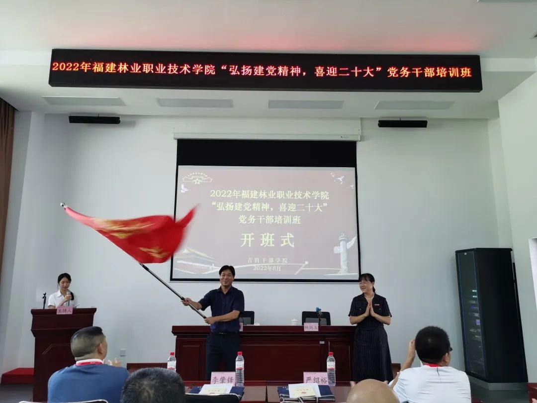 更新时间:2022/09/01 00:54本网讯 根据院党委部署,为进一步推动党史学习教育常态化长效化,深化党建领航提质增效,提高党务干部理论水平和工作能力,夯实基层党组织战斗力,2022年8月27日,由院党委主办的2022年学院“弘扬建党精神,喜迎二十大”党务干部培训班开班仪式在全国党员教育培训示范基地——古田干部学院顺利举行。院党委副书记严绍裕出席仪式并作动员讲话。古田干部学院、中共龙岩市委党校教授、古田会议精神研究中心主任林炳玉代表古田干部学院致欢迎辞,并代表古田干部学院为培训班授旗。学院57位党务干部参加仪式。