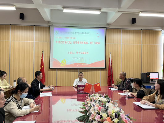 更新时间:2022/11/08 16:53本网讯 2022年11月8日,学院副院长罗立仪以“中国式的现代化:高等教育的挑战、责任与使命”为题,为园林系师生党员上学习贯彻党的二十大精神专题党课。园林系全体教师党员和学生党员代表共同参与学习,受益颇丰。
