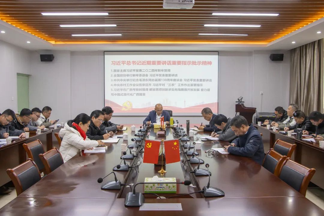 会议传达学习了习近平总书记发表的二〇二四年新年贺词精神、在全国政协新年茶话会上的重要讲话精神、在纪念毛泽东同志诞辰130周年座谈会上的重要讲话精神、在中央农村工作会议对“三农”工作作出重要指示精神、在广西考察时的重要讲话精神。会议强调,学习贯彻习近平总书记重要讲话重要指示批示精神,要深刻认识思想统一是政治统一、行动统一的基础,要持之以恒加强学院党委自身建设,带头用习近平新时代中国特色社会主义思想凝心铸魂,坚持把党的全面领导贯穿到学院工作的全过程各方面,深刻领悟“两个确立”的决定性意义,增强“四个意识”、坚定“四个自信”、做到“两个维护”。