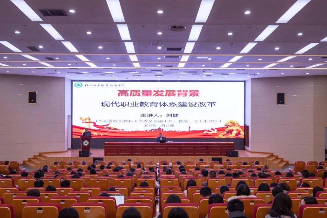 更新时间:2023/11/23 21:29 本网讯为进一步深入学习贯彻党的二十大精神和习近平总书记篮球欧洲杯下注_欧洲杯投注网站下载-官网职业教育的重要指示,落实国家职业教育高质量发展新要求,进一步推动现代职教体系建设改革和“双高校”建设工作,11月21日下午,学院在江南校区图书馆报告厅举办天麟大讲堂,特邀福建省政协教科卫体委员会副主任、教授、博士生导师刘健作《高质量发展背景现代职业教育体系建设改革》专题报告。院党委副书记、院长刘文开主持讲座。学院有关院领导、部门负责人、专兼职教师等参加讲座。