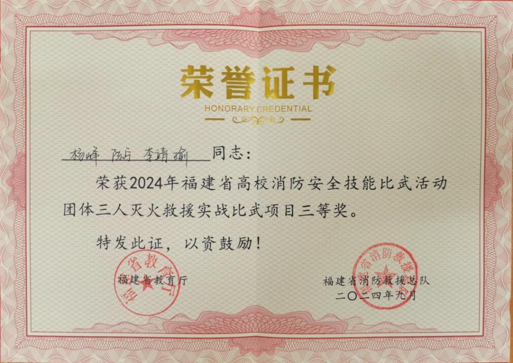 更新时间:2024/09/29 22:06本网讯 近日,由福建省消防救援总队举办的2024年福建省高校消防安全技能比武活动大赛在福州大学落下帷幕,31支来自福建各个高校的参赛队伍同台竞技。我院党委副书记严绍裕带队参加了此次大赛团体灭火救援项目比赛,经过两天的激烈角逐,喜获三等奖的优异成绩。