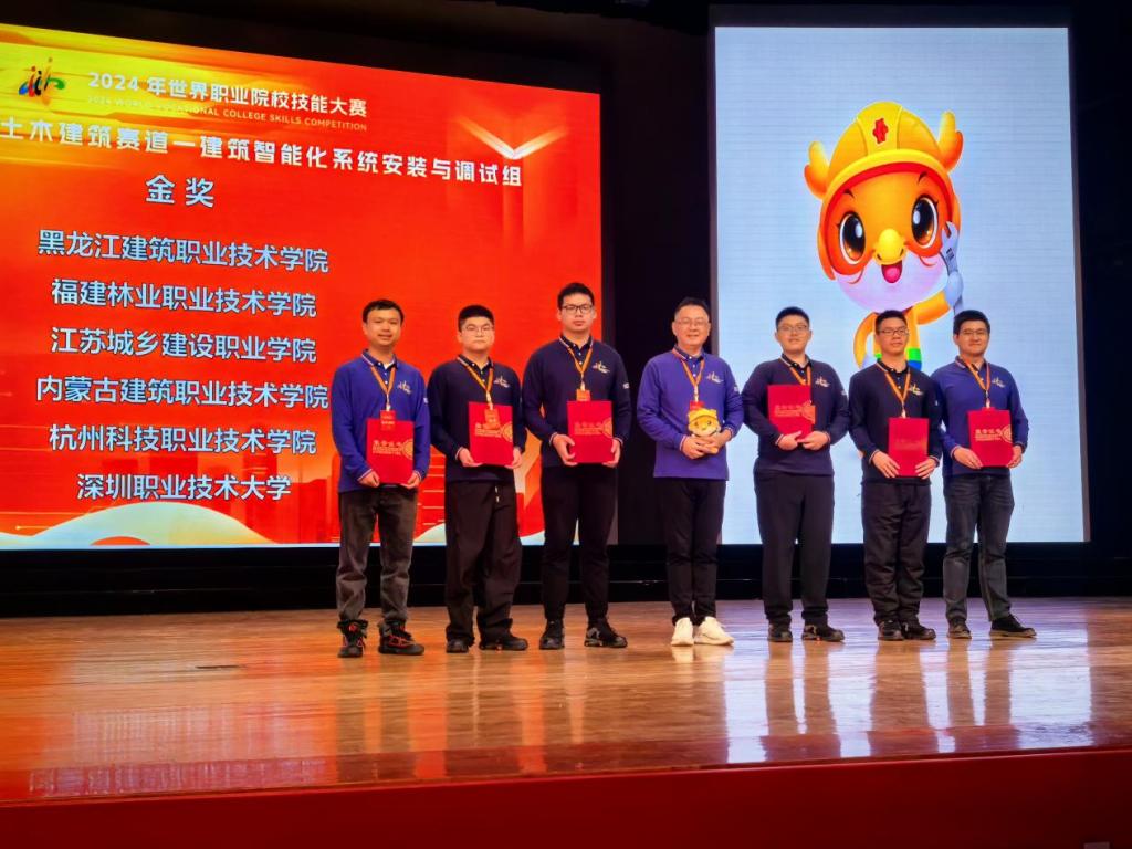 本报讯(张李平)10月28日至31日,在2024年世界职业院校技能大赛(高职组)总决赛“建筑智能化系统安装与调试”赛项中,篮球欧洲杯下注_欧洲杯投注网站下载-官网的林剑雄、连林炜、任熠、官豪轩四位同学在建筑工程系主任彭忠伟带队以及卢健杰、蒋一鸣老师的指导下,从来自全国29个省(自治区、直辖市)的56支参赛队、207名选手中脱颖而出,凭借扎实专业素养、现场卓越表现一举夺得全国金奖,指导教师获“优秀指导教师”荣誉称号。