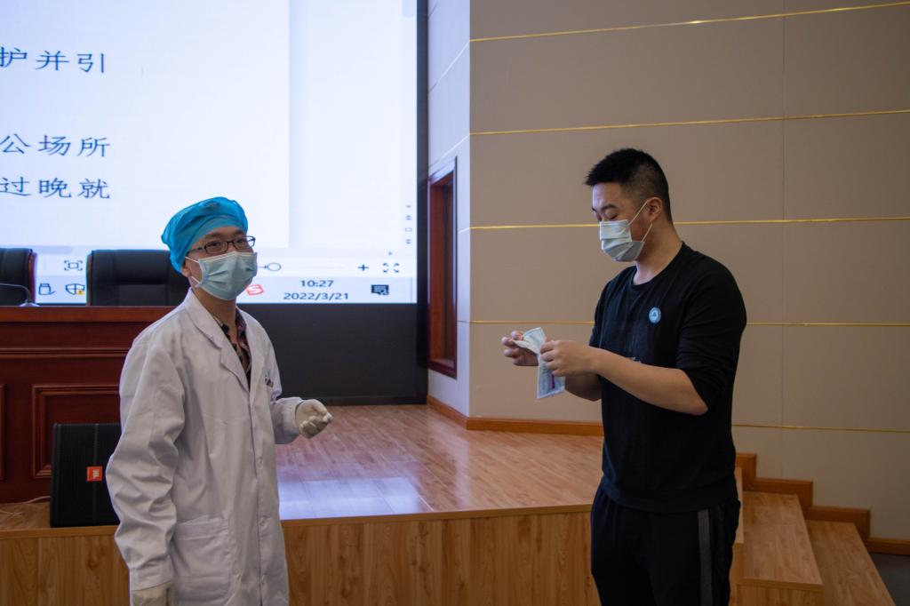 ▲校医在做好二级防护的情况下,要求感染者二级防护并引导至临时观察点,等待转运。
