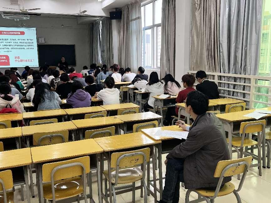5月16日,院党委委员、副院长谢金生走进江南校区教学楼605教室听思政课教师李玲给林业技术2201、2202班上“毛泽东思想和中国特色社会主义理论体系概论”课。
