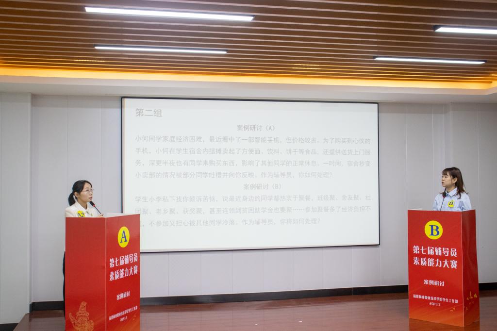 现场比赛环节在江南校区行政楼第四会议室举行。福建师范大学美术学院党委副书记乐有方,福建师范大学音乐学院党委副书记杜成煜担任比赛评委。我院学生工作部部长蔡敏、学生工作部副部长吴旻以及各系学生科长和全体专职辅导员进行了现场观摩。现场比赛由经济管理系辅导员吴艺菀主持。