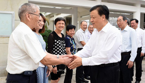 6月6日至8日,中共中央政治局常委、中央书记处书记刘云山在福建调研。这是6月7日,刘云山在东山县谷文昌纪念园同谷文昌亲属和身边工作人员亲切交谈。新华社记者 饶爱民 摄展。
