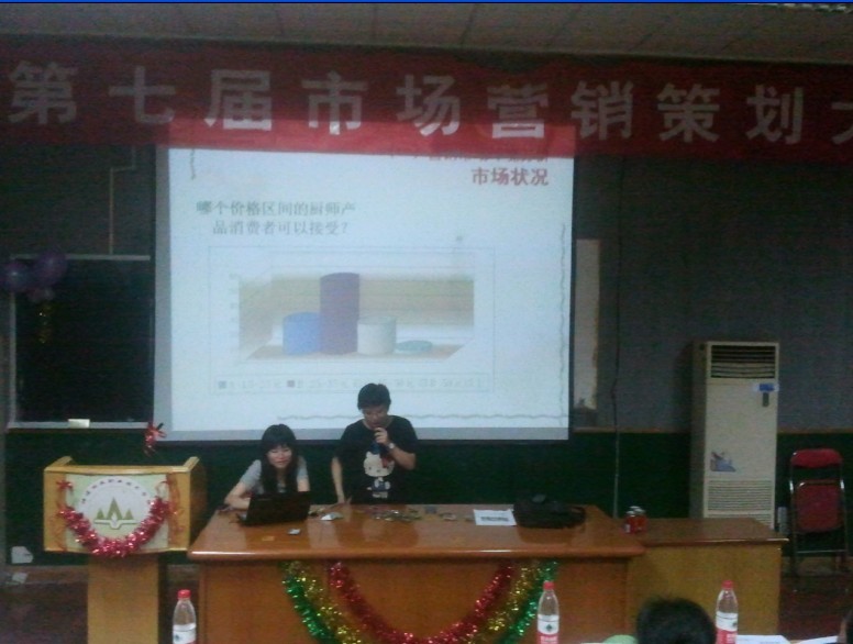队市销1106班的同学就目前“洗碗机”在市场以及社会的销售状况、响应和市场机遇等进行分析,并作了相关策划,博得了满堂彩,得了一等奖。