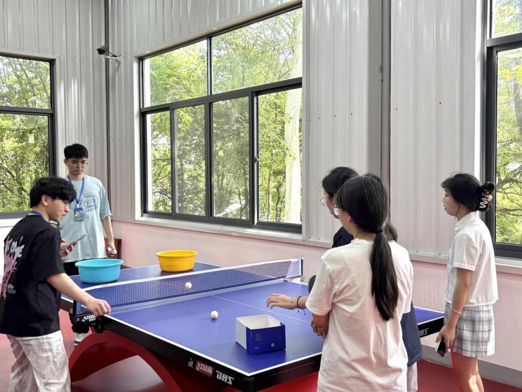 选手持球拍将乒乓球击入对面水桶,一分钟内成功三颗即通关。瞄准、挥拍、入桶,一系列动作考验精准度,成功命中时现场响起阵阵掌声。