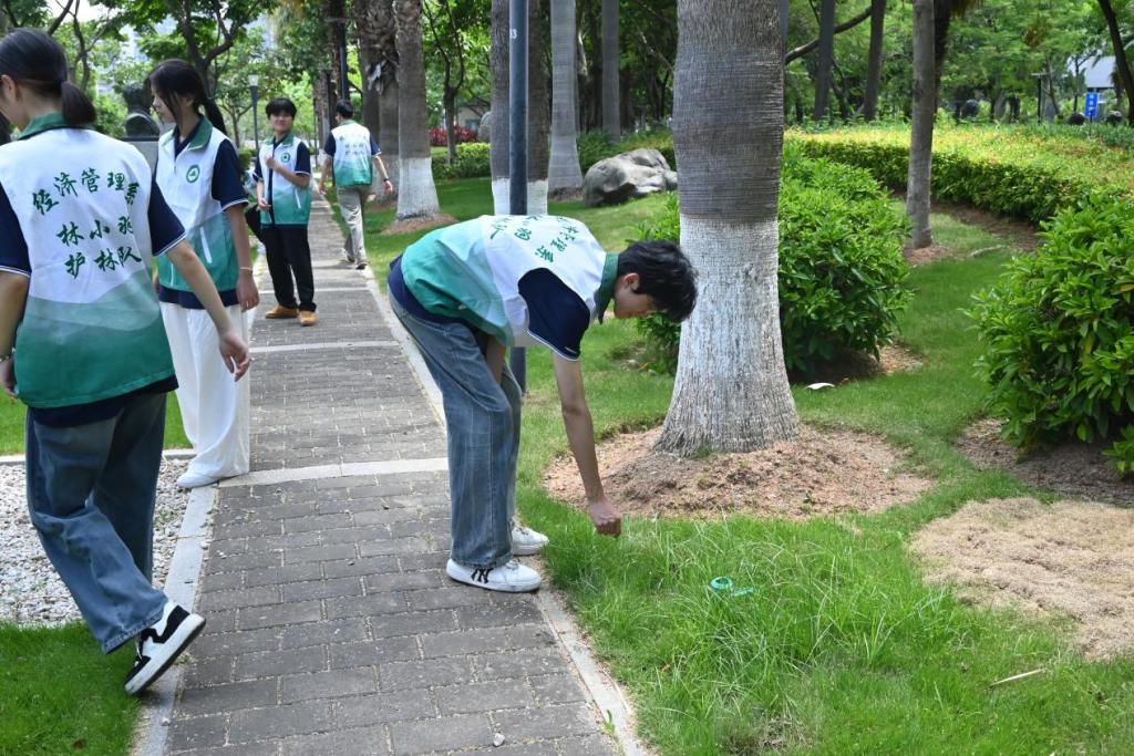同时,在五缘湾旁的厦门海洋公园内还活跃着经济管理系“林小羽”志愿者们的身影。他们高举“守护碧海蓝天,践行绿色使命”的旗帜,以饱满的热情投身清洁垃圾志愿活动。此次活动不仅是对生态文明建设的积极响应,更是一堂生动的社会实践课,既体现了新时代青年守护绿水青山的责任担当,也是将绿色发展理念融入社会实践的生动诠释。