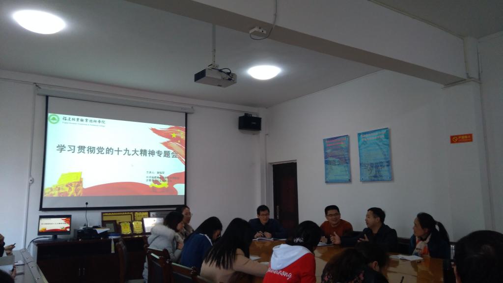 为深入学习党的十九大精神,把党的十九大新理念、新思想、新举措宣传贯彻到位,2017年12月26日下午,经济管理系党总支在系会议室召开专题学习会。会议由经济管理系党总支书记谢福荣主持,学院副院长罗立仪出席会议,系教工党支部、学生党支部全体师生党员、系非党员教师参加会议。