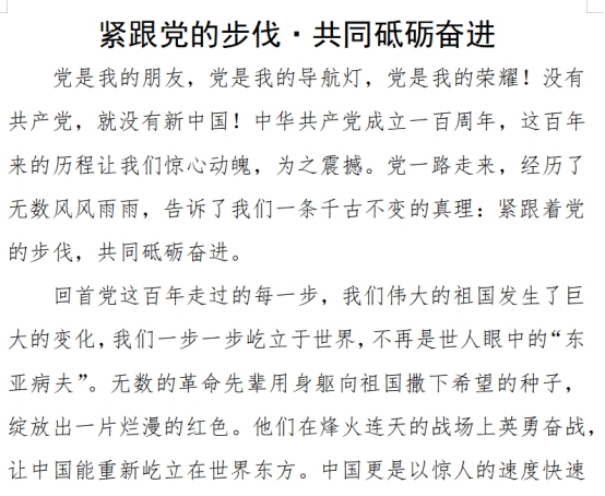 参加比赛的同学们认真构思写作,通过笔下的文字书写了对百年党史的感想,抒发对党的敬佩与感激,表达了“永远跟党走、奋进新征程”的决心,书写了中国青年们在新文化运动时期,积极探索救国道路;在中华人民共和国成立后,积极参与国民经济恢复的各项工作,主动支援抗美援朝,争当建设社会主义的积极分子;在党的十一届三中全会后,积极投身建设中国特色社会主义伟大实践的青春故事。