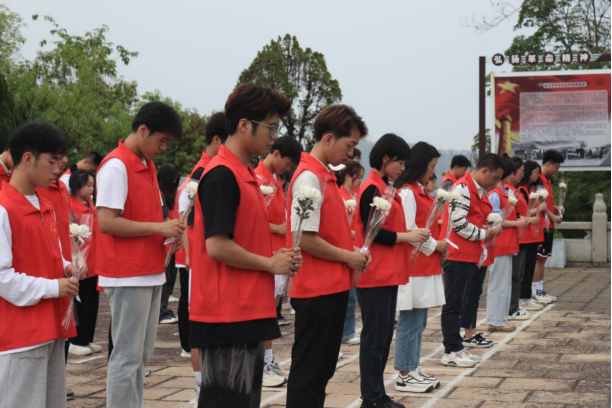 全体师生一起攀登百余级台阶到达目的地,在九峰山革命烈士纪念碑前整齐列队,面向纪念碑垂首肃立默哀,向各个历史时期为争取国家独立和民族解放而英勇献身的革命先烈致敬。
