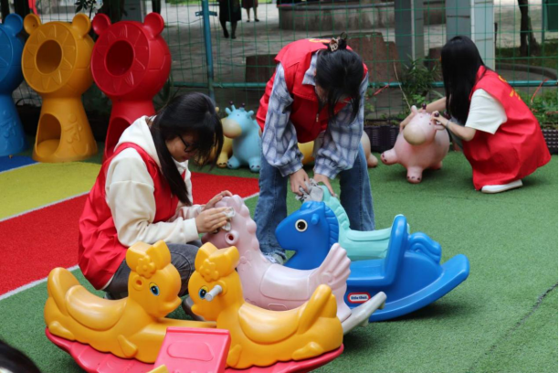 活动开始前,志愿者们来到小明星幼儿园进行准备工作,挂起系旗和园旗,打扫园内卫生,布置场地。场地布置完成后,志愿者们与幼儿园的老师一起出发,到附近宣传本次公益早教活动。