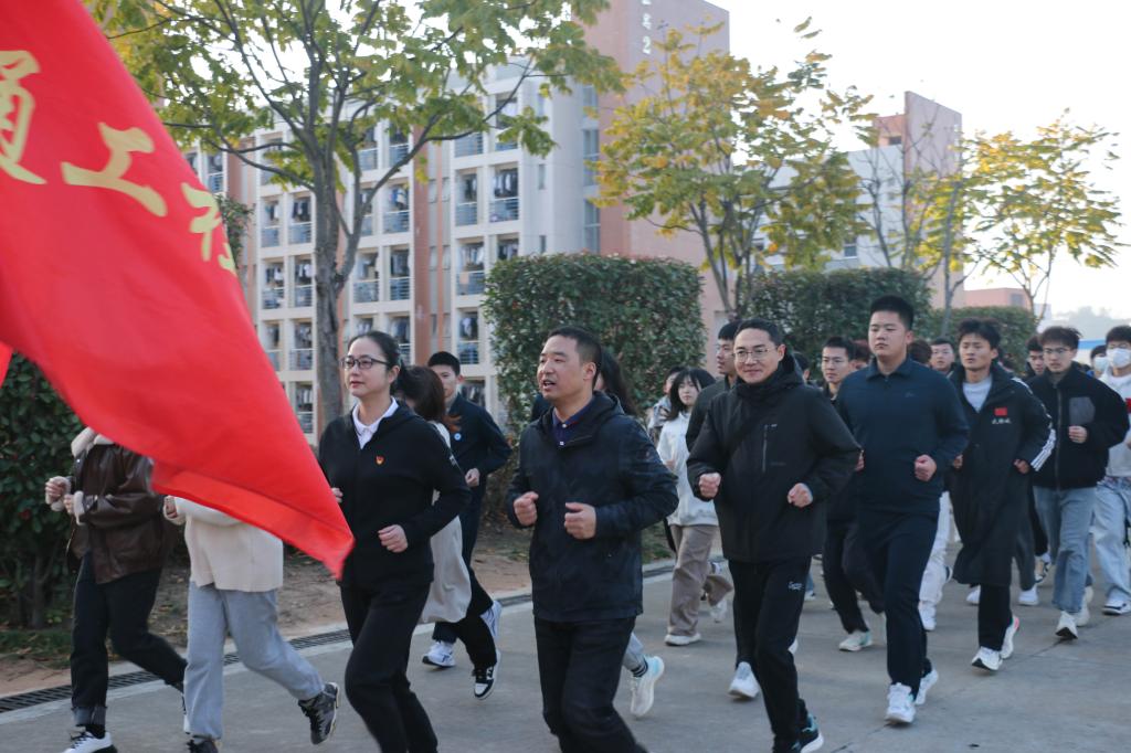 合格的党员同志不仅要拥有正确的大思政观,也要以整体素质提升为目标,坚持体育强身,在自我革命和强健体魄中壮筋骨。随后,陈莉书记向晨跑旗手授旗,正式宣布晨跑活动开始。在经过充分的热身运动后,大家精神抖擞尽展青春活力,按照规定路线环跑校园最终到达人工湖集中。在嘹亮的“永远跟党走青春献强国”口号中,晨跑活动圆满结束。