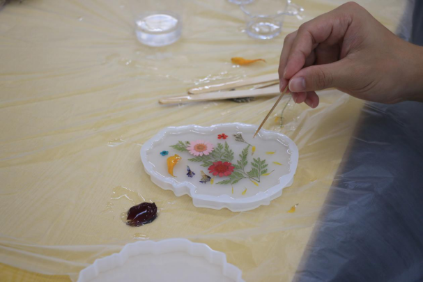 活动中,在草木缘协会学生的细心讲解下,师生党员、入党积极分子先根据3:1的比例调制胶水,并将其搅拌成无气泡无絮状物后并倒入模具,把自己喜欢的干花干草轻轻放置其中,摆放出符合美感的设计图案,最后倒入剩下的滴胶液体进行封顶。放置24小时后风干,待完全凝固后,剥开模具,即可完成。