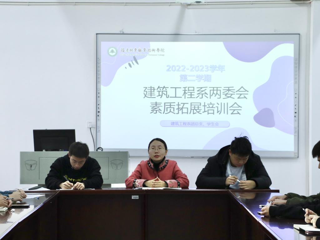 新学期伊始,为提升我系两委会学生干部素质,加强学生干部队伍建设,增强组织凝聚力,更好地协同开展新学期两委会工作,2023年2月17日在建工楼5楼会议室召开了2022-2023学年第二学期第一次两委会学生干部素质拓展培训会,本次培训会由建筑工程系学生科科长兼团总支书记刘克芹主持,建筑工程系两委会主席团、各部门部长以及部分大一干事代表参加培训。