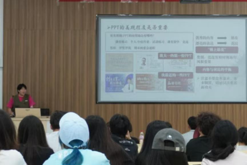 随后,系团总支副书记蔡佳怡同学带来《PPT制作与美化进阶指南》,结合应用场景差异,解析内容表达与视觉设计的平衡之道,重点阐述字体选择、艺术字运用等细节对信息传递效果的影响,助力提升汇报展示质量。