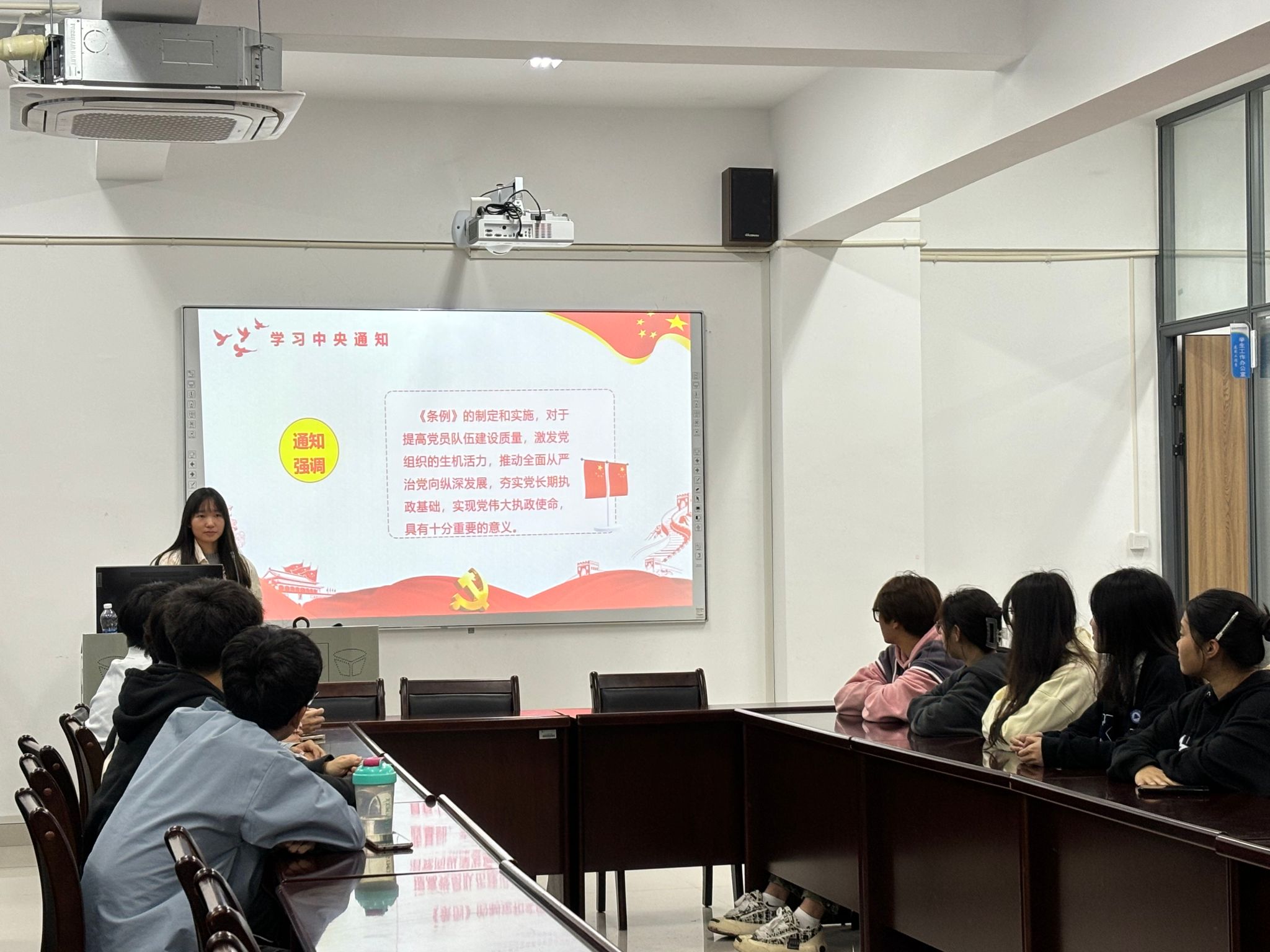 陈慧婷书记在讲解中着重强调,支部全体成员必须深刻领会《条例》精神实质,准确把握核心要求。她要求,每一位党员,无论身处何种岗位、担任何种职务,都要切实提高政治站位,将学习贯彻《条例》作为一项重要政治任务。要坚持学思用贯通、知信行统一,自觉用《条例》规范自身言行,主动增强组织观念与党员意识,认真履行党员义务,积极行使党员权利。要将《条例》的学习成果转化为锤炼党性、改进作风、服务同学的强大动力,在日常学习、工作和生活中,时刻以党员标准严格要求自己,勇于担当作为,切实发挥先锋模范作用。同时,要对照《条例》规定,主动检视自身在思想、学习、作风等方面存在的差距与不足,做到即知即改、立行立改,不断实现自我净化、自我完善、自我革新、自我提高。