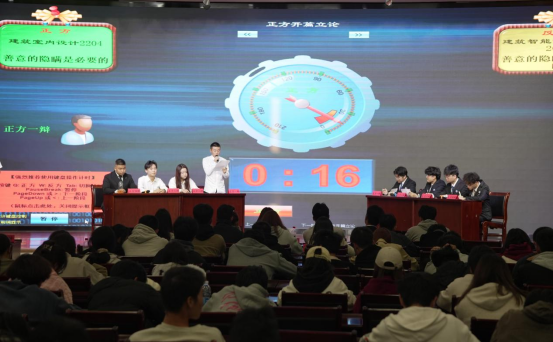 活动开始由主持人请正反方辩手入场,宣布第一场比赛开始,进入立论和陈词环节,正反两方进行观点的碰撞,帮我们打开新的认知角度,陈述着“接受人生的荒谬是一种强大的表现”与“接受人生的荒谬是一种懦弱的表现”,在对辩双方就着辩题激烈的辩论中,现场氛围逐渐燃了起来,比赛有序的进入到结辩环节,思想的交锋,让这场辩论赛愈发激烈。