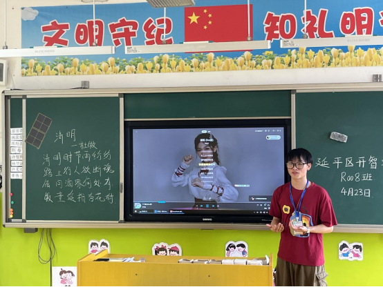 “清明时节雨纷纷,路上行人欲断魂”。故事课上传来了孩子们朗朗的读书声,一首广为传颂的古诗《清明》,字里行间鲜活生动,意境优美。志愿者们以故事、图片等形式向孩子们讲解了清明节的由来、起源和历史背景,还通过视频向孩子们展现了《介子推》的故事,进一步加深他们对清明传统习俗的认识。