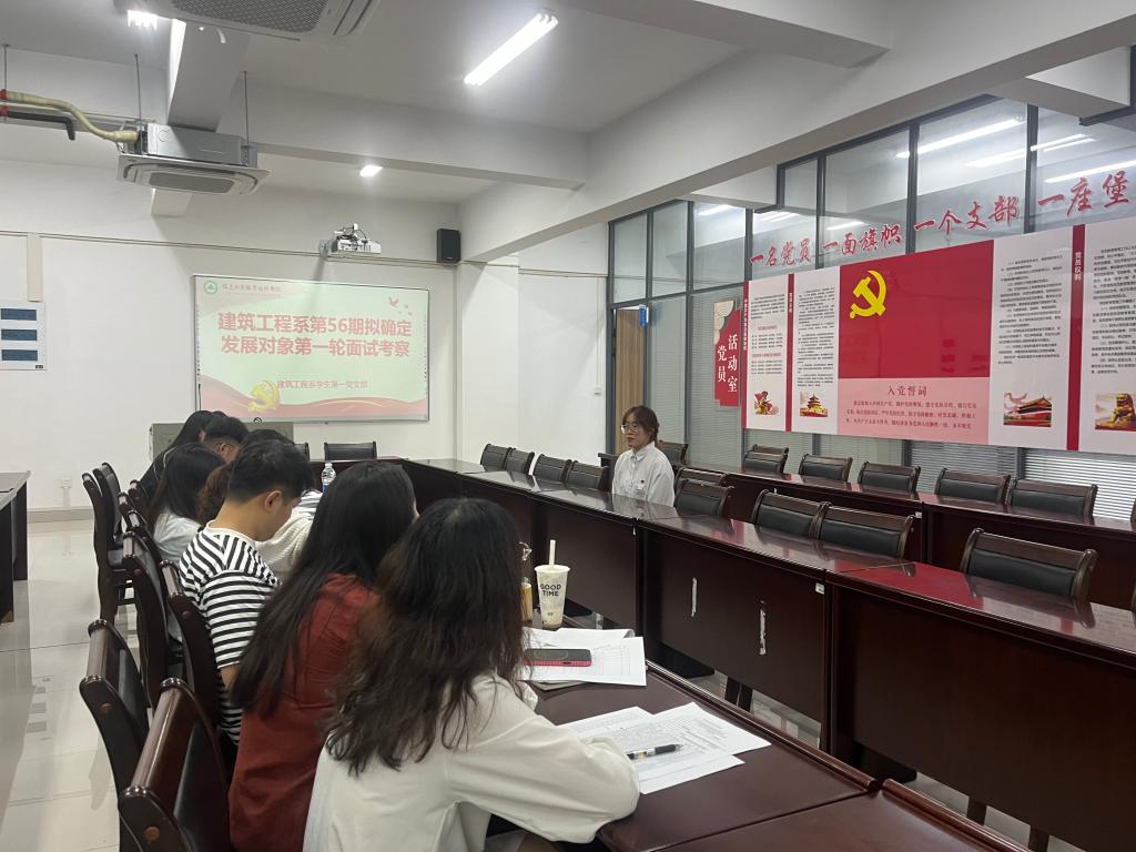面试部分由建筑工程系学生第一党支部教师党员及56期入党积极分子辅导员担任面试的评委,着重对入党积极分子的政治理论学习情况、时事政治、入党动机、入党规划等方面进行考察,通过与入党积极分子们的互动交流,老师们从中了解他们的思想状况和现实表现,也从现存的问题中提出了宝贵的意见和建议,希望他们能够更加深刻地理解党的性质和使命,在今后的学习和工作中继续以青年之力担起应尽的责任和义务,不断追求进步、完善自我。