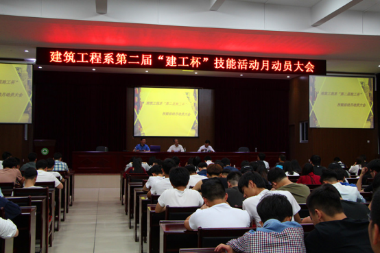 2017年4月18日晚上19点15分,建筑工程系在江南校区大礼堂举办第二届“建工杯”技能活动月动员大会。学院副院长严绍裕、系主任郑金兴、副主任彭忠伟及全系师生参加了动员大会。