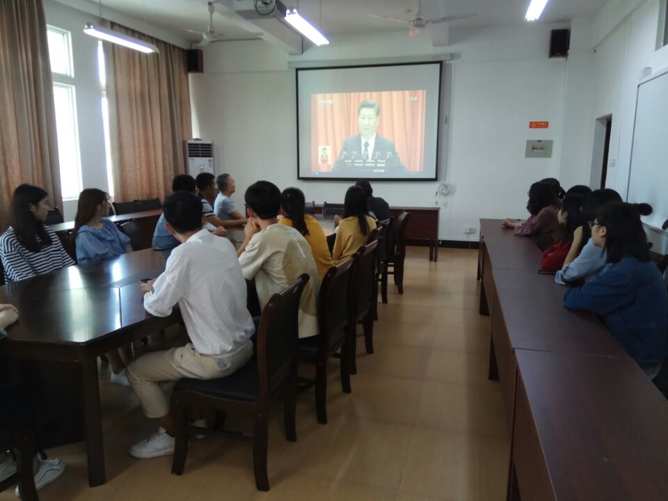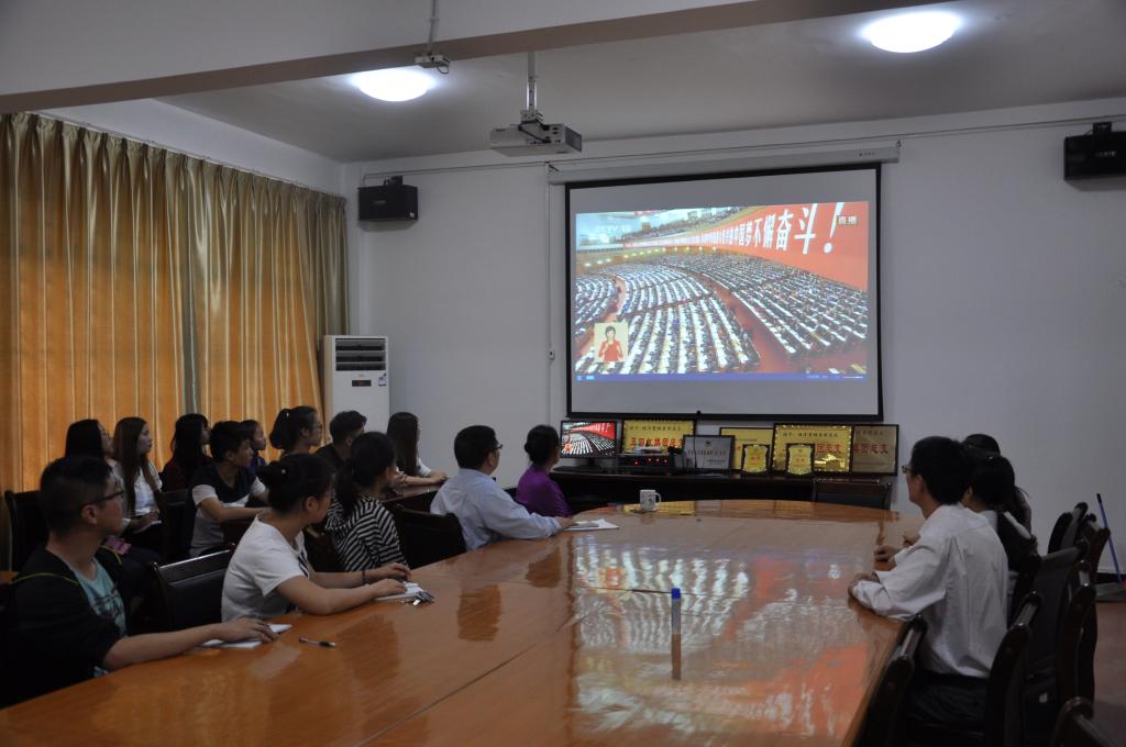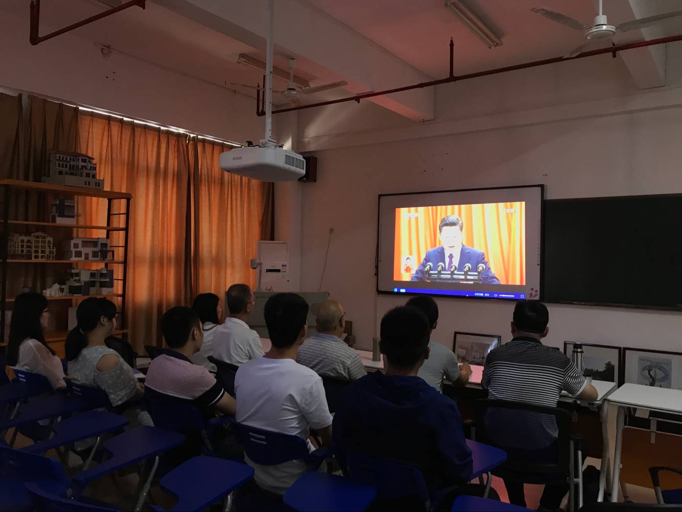 △建筑工程系党总支组织师生党员和辅导员在系部会议室观看直播