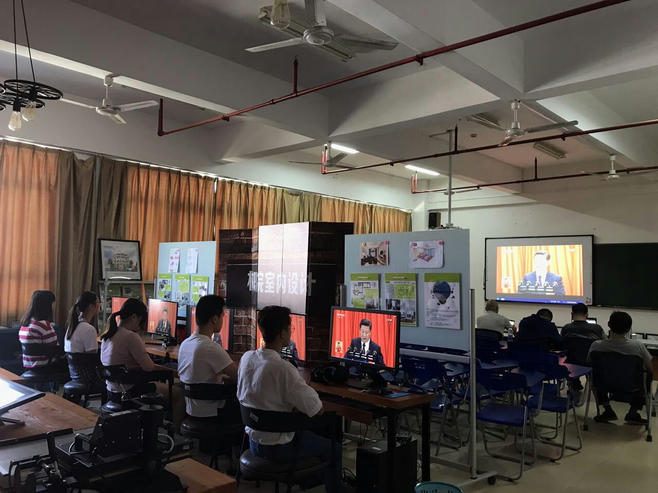 △艺术设计系党总支组织师生党员和辅导员在系部会议室观看直播