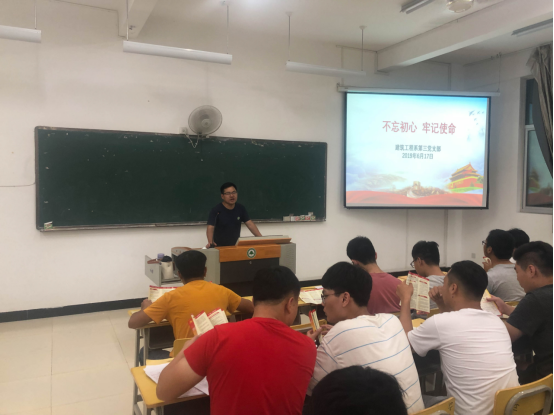 本网讯 为增强毕业生党员“四个意识”、“两个维护”、“四个自信”教育,坚定理想信念,加强组织纪律观念,切实做好毕业生党员组织关系转接工作,6月17日晚7:00,建筑工程系党总支、学生各支部专门针对毕业生党员群体召开了“我是党员我奉献”的主题教育大会。系党总支书记王云彪、系党总支委员陆晓莉、温全军老师出席,建筑工程系2019届全体毕业生党员参加本次活动。