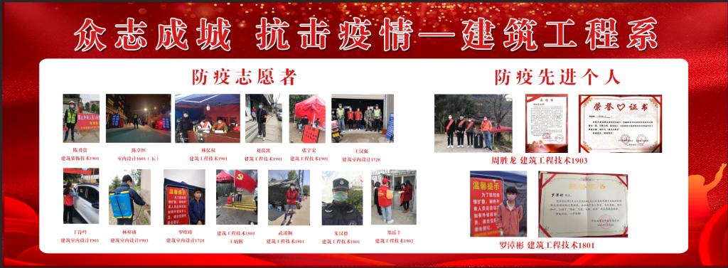 2020年,在新冠肺炎疫情发生后,建筑工程系一批学生志愿者冲在前线,在人民群众的生命安全和身体健康受到严重威胁的紧要关头,挺身而出,勇于和疫情作斗争。据统计,建筑工程系先后共有29名学生参与到抗击疫情的志愿服务当中,用实际行动响应号召,为早日打赢疫情防控阻击战贡献青春力量。为在学生群体中弘扬听党指挥、冲锋在前,勇于担当,发挥连续奋战精神,建筑工程系在学生公寓3-4楼大厅宣传栏进行“众志成城、抗击疫情”志愿者宣传,在潜移默化中引导学生树立“四个正确认识”,践行社会主义核心价值观。