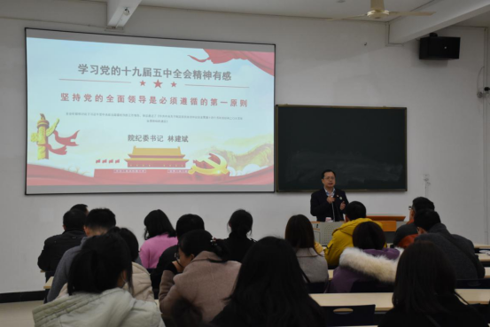 本网讯 为进一步学习领会党的十九届五中全会精神,增强“四个意识”、坚定“四个自信”、做到“两个维护”,切实把思想和行动统一到全会精神上来,推动新时代教育教学工作高质量发展,2020年12月16日下午,院纪委书记林建斌在实训四210教室分享学习党的十九届五中全会精神感想,建筑工程系全体教师、学生党员参加,本次分享会由建筑工程系党总支书记王云彪主持。