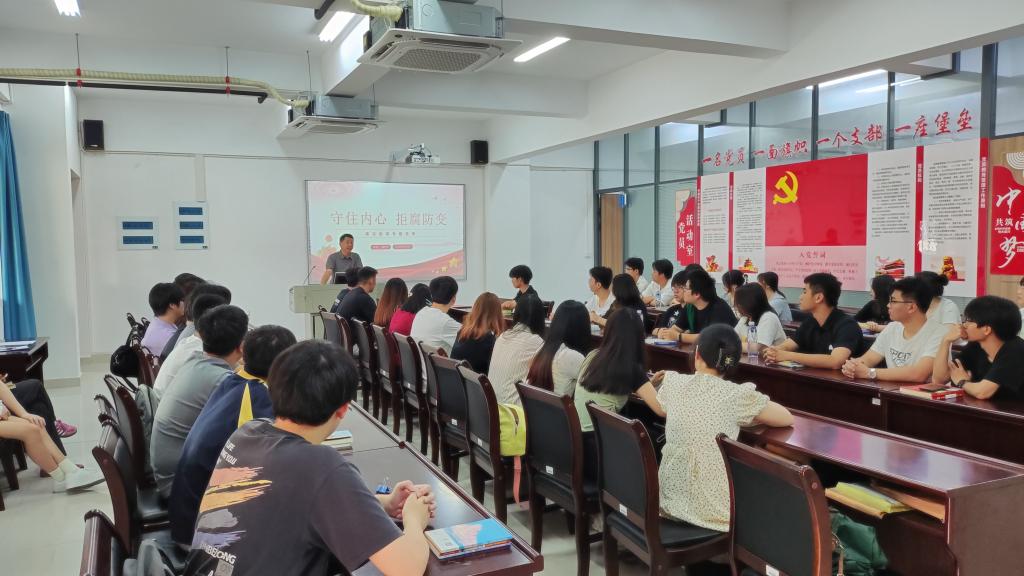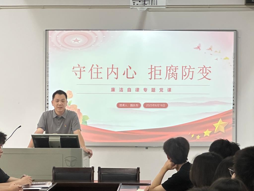 本网讯/为扎实推进深入贯彻中央八项规定精神学习教育走深走实,切实增强毕业生党员廉洁自律意识,加强毕业生党员党性教育,教育引导建筑工程系2025届毕业生党员以高昂的斗志和青春的姿态在现代化建设新征程上奋勇争先、开拓创新,积极作为,走好自己的人生之路,2025年6月17日上午,建筑工程系党总支书记魏长专做主旨为“守住内心 拒腐防变”专题讲座。全系54期、55期和56期全体毕业生党员等43人到场聆听。