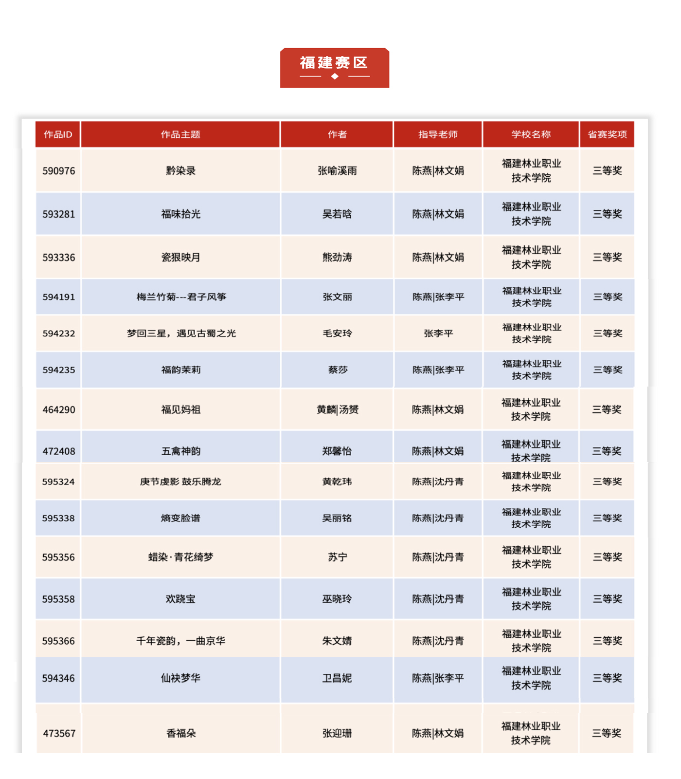 在第九届 “米兰设计周 - 中国高校设计学科师生优秀作品展” 职教赛道省赛中,我系师生积极响应、踊跃参与,在教师陈燕、林文娟、沈丹青、张李平老师的悉心指导下,凭借扎实的专业功底与独特的创意构思,从全省数千件参赛作品中脱颖而出,斩获二等奖3名,三等奖15名等多项殊荣,充分展现了我系在设计学科教育教学中的卓越成果与师生昂扬向上的精神风貌。名单如下:
