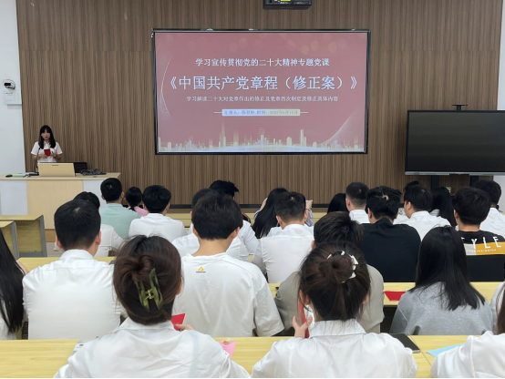 党课上,陈慧婷书记结合自身对《中国共产党章程(修正案)》的学习感悟,从“中国共产党章程基本概述”、“二十大对党章作出哪些修改”、“党章历次制定及修正具体内容”、“党章修正案五大新特点”四个方面对新修订党章进行了深入浅出的解读。中国共产党第二十次全国代表大会通过了《中国共产党章程(修正案)》,共修改50处,其中总纲部分的修改37处,条文部分的修改13处。修改后的党章充分体现马克思主义中国化、时代化的最新成果,充分体现党的十九大以来党中央提出的治国理政新理念、新思想、新战略,充分体现党的工作和党的建设新鲜经验,以适应新形势、新任务对党的工作和党的建设提出的新要求。