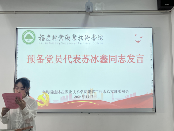 随后,预备党员代表苏冰鑫同志发言,她表示,入党宣誓是一名党员政治生命开始的象征,她将会永远记住这个神圣的时刻,把入党誓词作为自己终身的追求、终身的修养和终身的实践。同时,她说到,要深深地感谢党组织对他们的关心、培养和教育;感谢党组织的老师和老党员对他们的关爱、激励和帮助。将高举党的旗帜,用实际行动争做一名先进的共产党员,一名合格的共产党员!