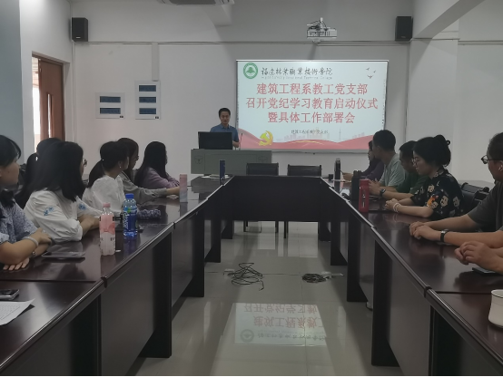 本网讯/2024年4月16日,建筑工程系教工党支部书记廖坤阳在建工楼会议室就新修订的《中国共产党纪律处分条例》文件向支部全体党员作专题解读和学习心得分享。