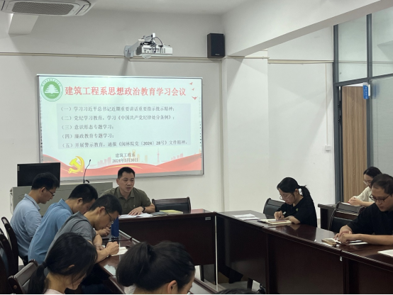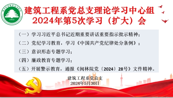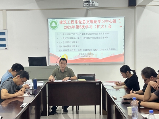本网讯/2024年5月30日,建筑工程系党总支组织召开系党总支理论学习中心组2024年第5次学习(扩大)会暨全系思想政治教育学习会,主要学习传达习近平总书记近期重要讲话重要指示批示精神;开展《中国共产党纪律处分条例》、意识形态专题、廉政教育专题等内容学习教育,并结合身边实际案例,开展警示教育;围绕《中国共产党纪律处分条例》开展专题学习研讨。全体中心组成员,全体教师党员出席学习会,学习会由建筑工程系党总支书记魏长专领学。