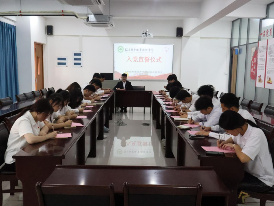 仪式在气势磅礴的《国际歌》中拉开序幕。学生第二党支部副书记林燕琼宣读新发展党员名单并表示祝贺。学生第一党支部书记陈慧婷带领新发展党员面向党旗,举起右拳,郑重宣誓:“我志愿加入中国共产党,拥护党的纲领,遵守党的章程,履行党员义务,执行党的决定,严守党的纪律,保守党的秘密,对党忠诚,积极工作,为共产主义奋斗终身,随时准备为党和人民牺牲一切,永不叛党。”